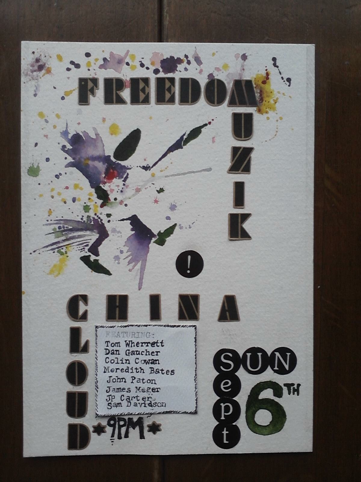 First up is tomorrow night (Sept 6th) at the China Cloud. A night of improvised music curated by none other than Mr. Colin Cowan. He’s calling the night Freedom Muzik. The musicians performing include Tom Wherrett, Dan Gaucher, John Paton, JP Carter, Sam Davidson, Meredith Bates, James Meger and Colin Edward Cowan: