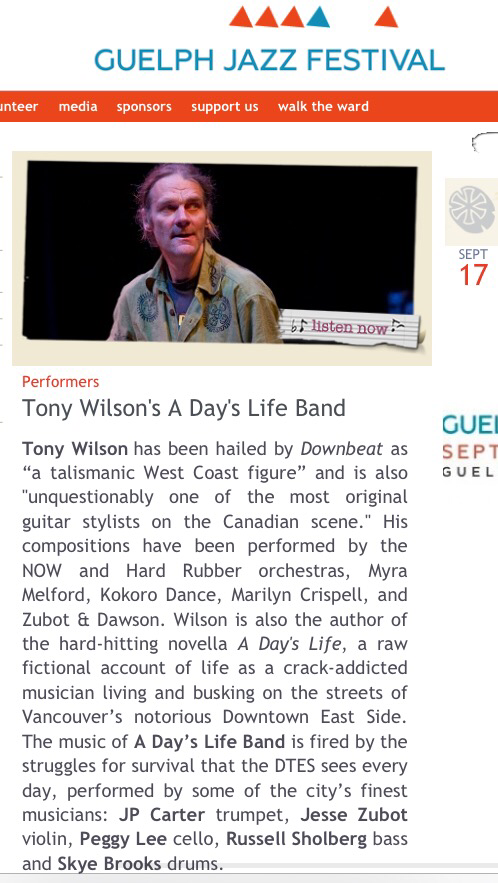 Finally on Sept 17th I’ll be flying out east to play at the Guelph Jazz Festival with Tony Wilson’s A Days Life Band (Tony Wilson, Peggy Lee, Jesse Zubot, JP Carter, Russell Sholberg, Skye Brooks). We’re playing at 1pm at a venue called Silence.